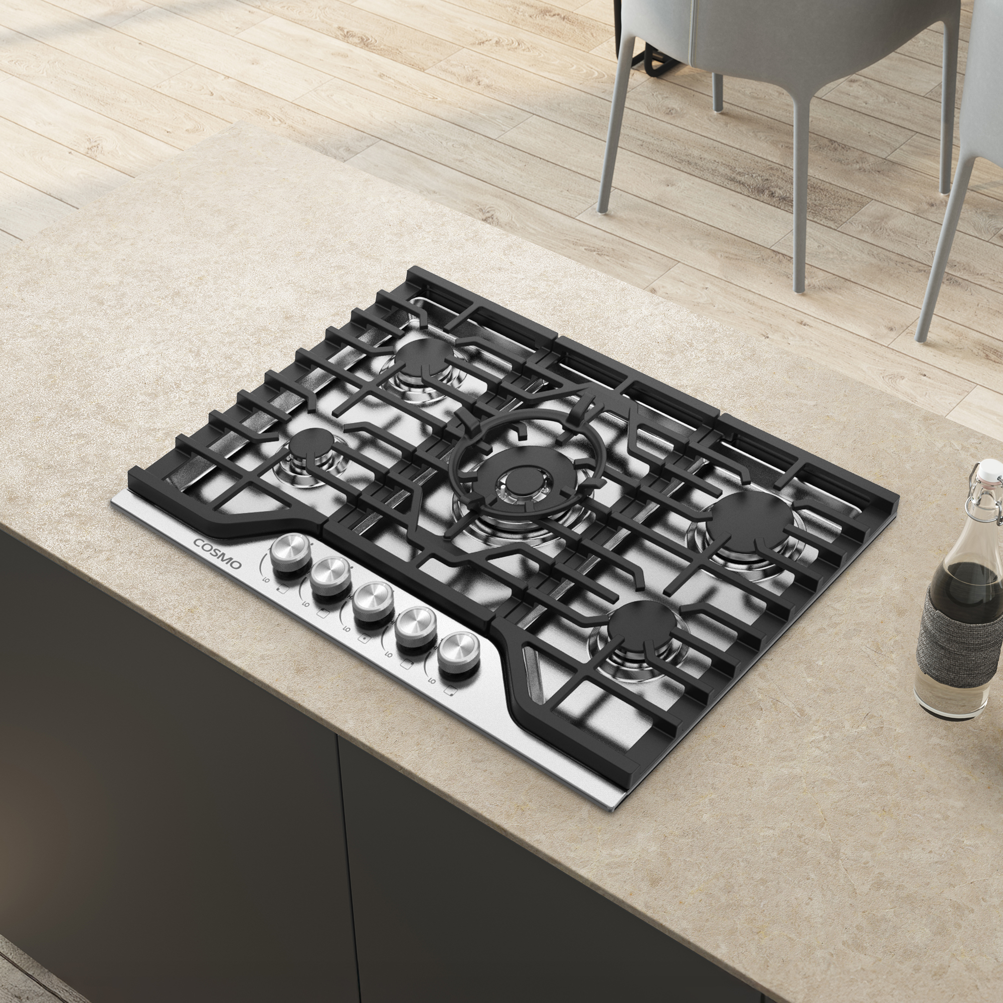 Discover everyday cooking made easy with Cosmo’s COS-CTGV305SS gas cooktop. The five burner design lets you cook multiple dishes at once, while the 22,000 BTU high power burner delivers fast boiling and strong searing when you need it. Durable cast iron grates provide stable support for cookware, and the included wok grate attachment adds versatility. Metal control knobs offer precise heat adjustment, and the stainless steel surface easily wipes clean. With auto ignition for reliable performance and added safety, this cooktop combines style, power, and convenience for any kitchen. The Cosmo Vista Collection brings enhanced functionality and design, offering a well-rounded option for those looking for more convenience and style in an appliance.