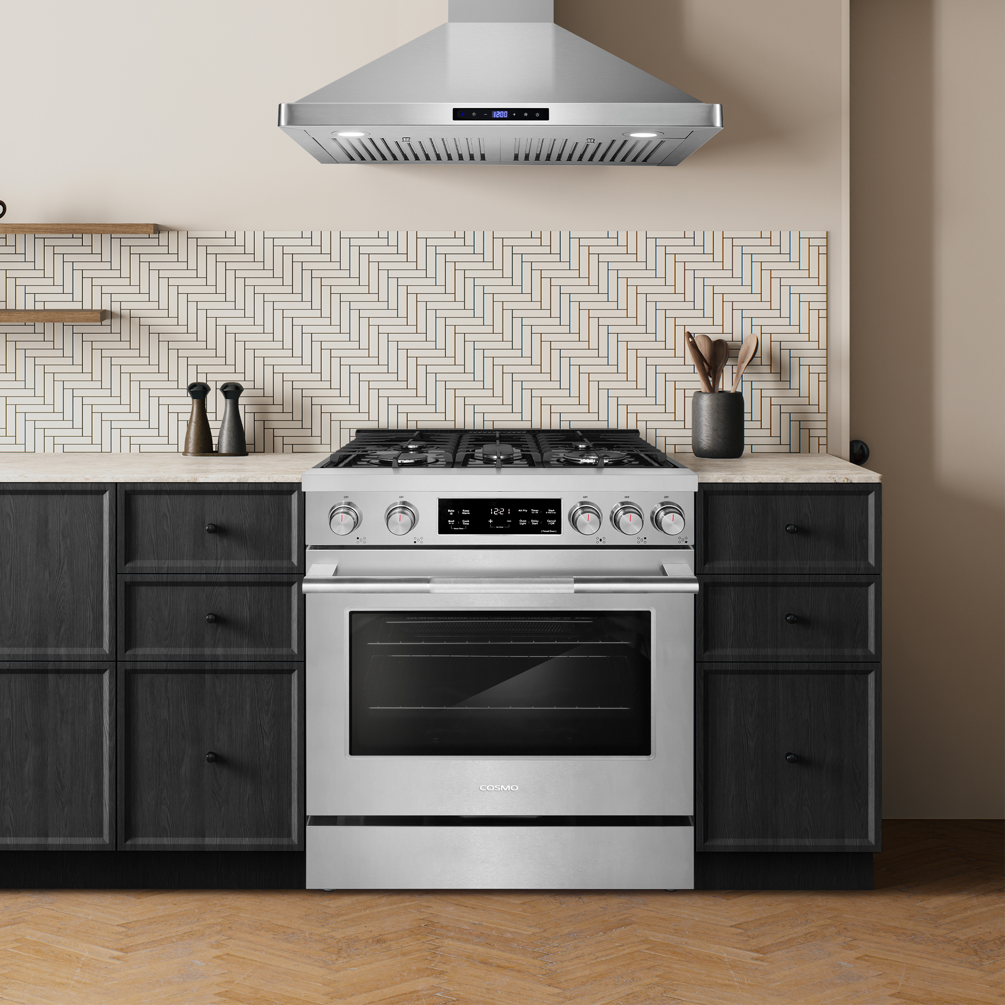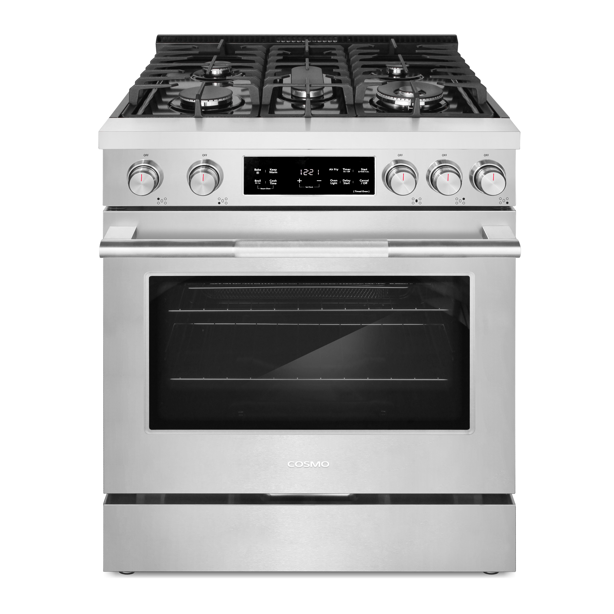 Elevate your kitchen with the Cosmo COS-RGS305SS 30 in. gas range, where modern design meets high quality performance. With a spacious 4.6 cu. ft. oven, it can handle daily cooking with ease. The gas cooktop features five high-performance burners: a 22,000 BTU burner, 18,000 BTU burner, 9,000 BTU burner, 6,000 BTU burner, and a 3,500 BTU burner. Inside the oven, a built-in convection fan ensures even heat distribution, delivering more consistent cooking results. Select from a range of oven functions, including air fry, to cook your favorite dishes faster and with less oil than conventional frying methods. Comes with an air fry tray designed to improve air circulation around food, ensuring even frying. For homes using propane, an optional Liquid Propane Conversion Kit is available (sold separately). Finished in sleek, durable stainless steel, this range is easy to maintain and built for long-lasting use. The Cosmo Stellar Collection offers reliability with essential features, providing a straightforward solution for those who seek practicality in an appliance.