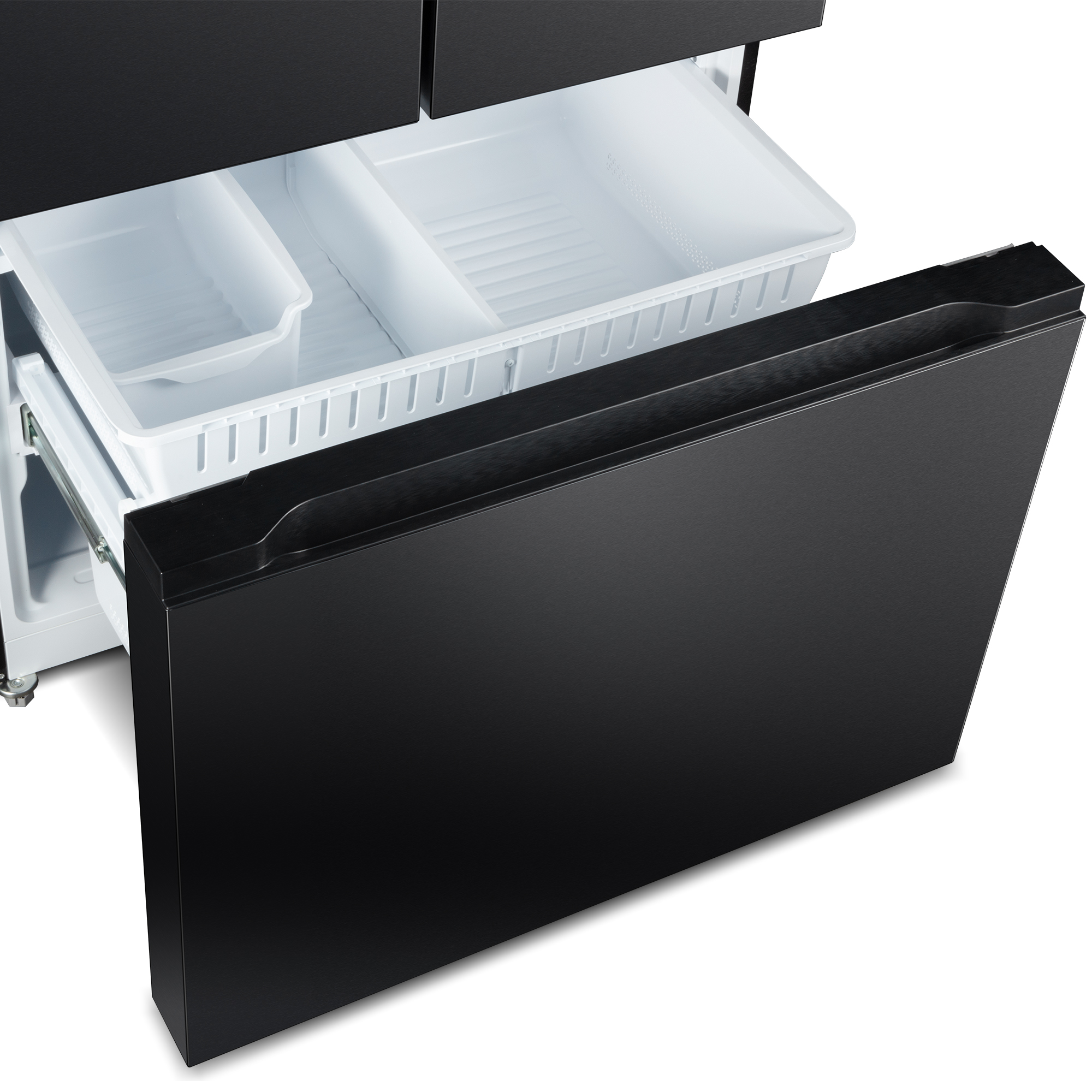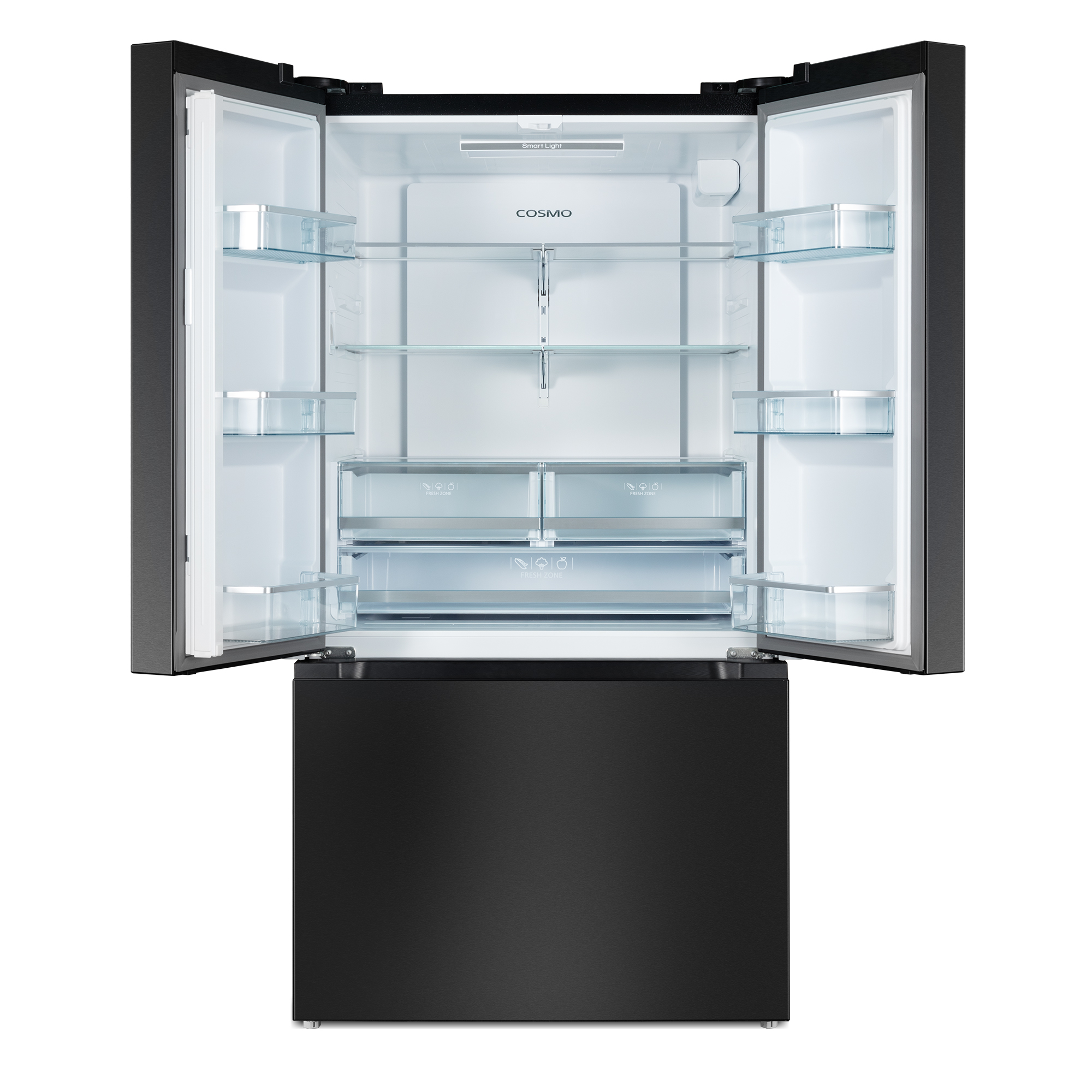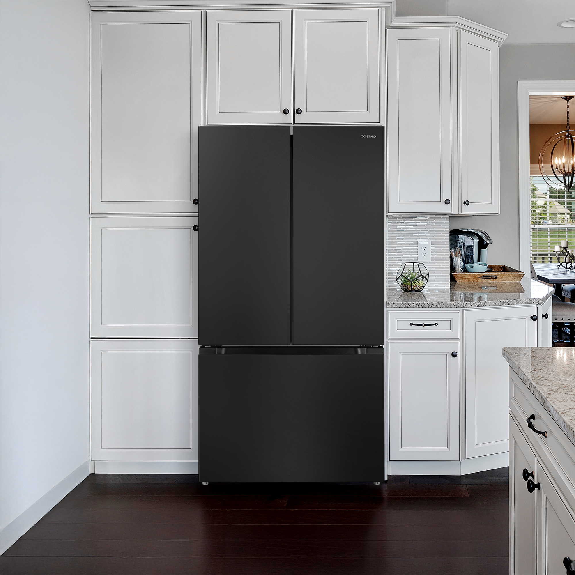 Introducing the Cosmo COS-RFFV283RBK 27.4 cu. ft. French Door Refrigerator in a sleek matte black finish that resists smudges and fingerprints. Designed to blend effortlessly into any kitchen, this fridge offers plenty of space and smart features to keep your food fresh and organized. The spacious bottom freezer drawer comes with a removable ice bin for easy access. The refrigerator’s adjustable shelves and enclosed crisper drawers give you flexible storage options. Energy-efficient LED lighting and a hidden hinge make it both practical and stylish. The recessed door handles give the refrigerator a streamlined look while saving space, making it easy to open and close the fridge. Includes an internal water dispenser to keep the refrigerator’s seamless look on the outside. Thanks to advanced preservation technology, your food will stay at the perfect temperature. Part of the Vista Collection, bringing enhanced functionality and design, offering a well-rounded option for those looking for more convenience and style in an appliance.