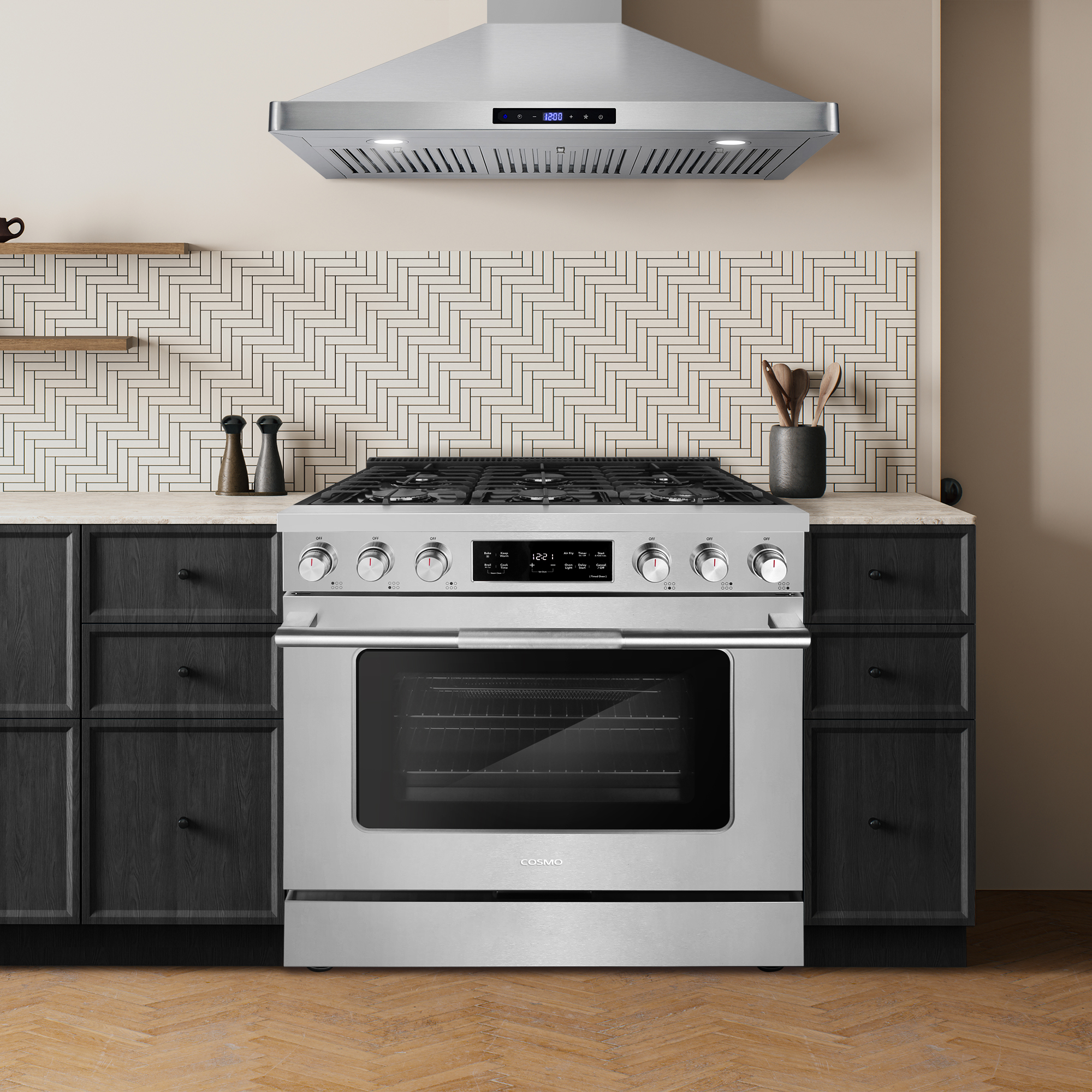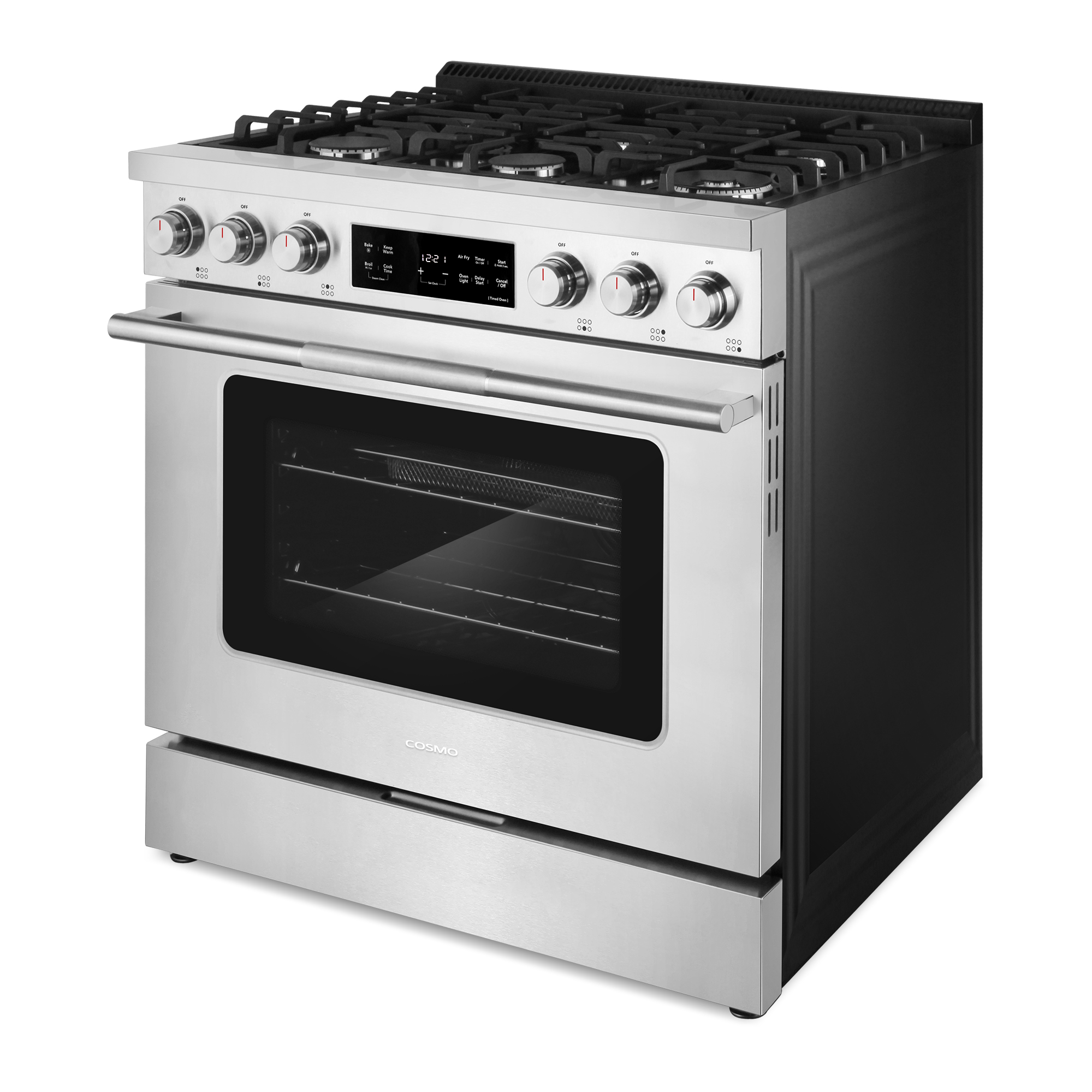 Give your kitchen a new look with the Cosmo COS-RGS366SS 36 in. gas range, combining a clean, modern look with solid everyday performance. The spacious 5.8 cu. ft. oven is well-suited for both daily meals and special occasions. On the cooktop, six gas burners provide a range of heat options: a 22,000 BTU burner, 18,000 BTU burner, two 12,000 BTU burners, a 6,000 BTU burner, and a 3,500 BTU burner. A built-in convection fan helps distribute heat more evenly throughout the oven. Select from a range of oven functions, including air fry, to cook your favorite dishes faster and with less oil than conventional frying methods. Comes with an air fry tray designed to improve air circulation around food, ensuring even frying. If needed, the range can be converted to run on liquid propane with a conversion kit (sold separately). With a stainless steel finish, this range is built for durability and easy cleanup. The Cosmo Stellar Collection offers reliability with essential features, providing a straightforward solution for those who seek practicality in an appliance.